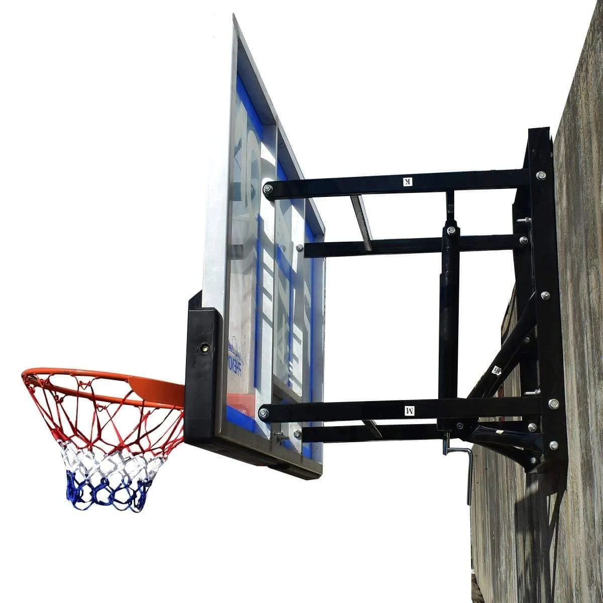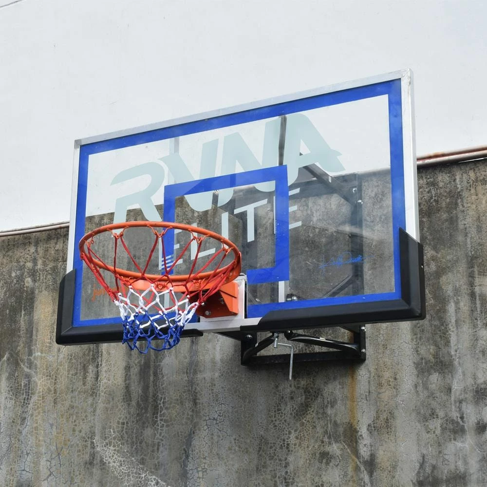 RVNA Elite Basketball Hoop System is a wall-mounted hoop system ideal for outdoor basketball games. It features a tempered glass backboard, a rim height adjustment, and a heavy duty mounting bracket for secure play—you can enjoy your game with no worries!