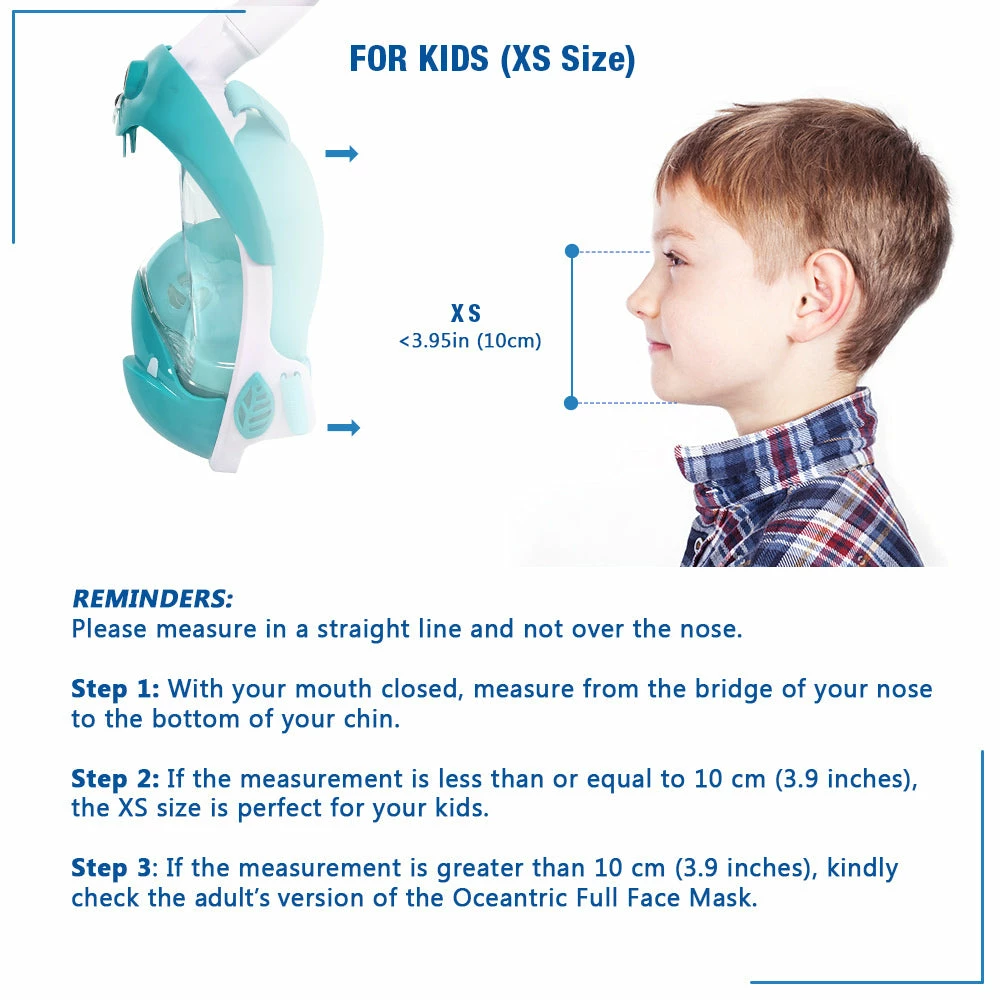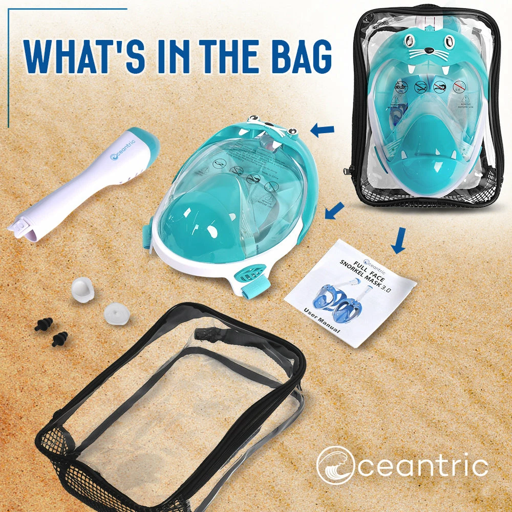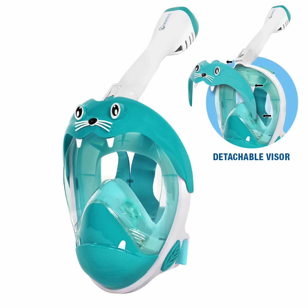 Oceantric Full Face Snorkel perfectly fit kids, aged 6-12 years old, available in four colors with a cute sea character design on the mask to encourage kids into the snorkeling adventure! - UPGRADED BREATHING SYSTEM