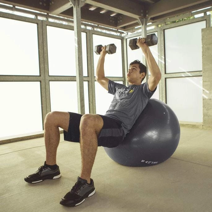 This 65 cm. Stability Ball is ideal to strengthen core muscles such as your abdominals and obliques. Built with a non-slip surface and heavy-duty materials, the SKLZ® 65cm. Stability Ball can handle rigorous workouts. Easily inflate the ball with the included dual-action pump.
