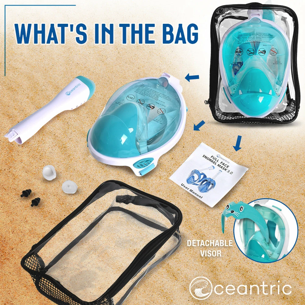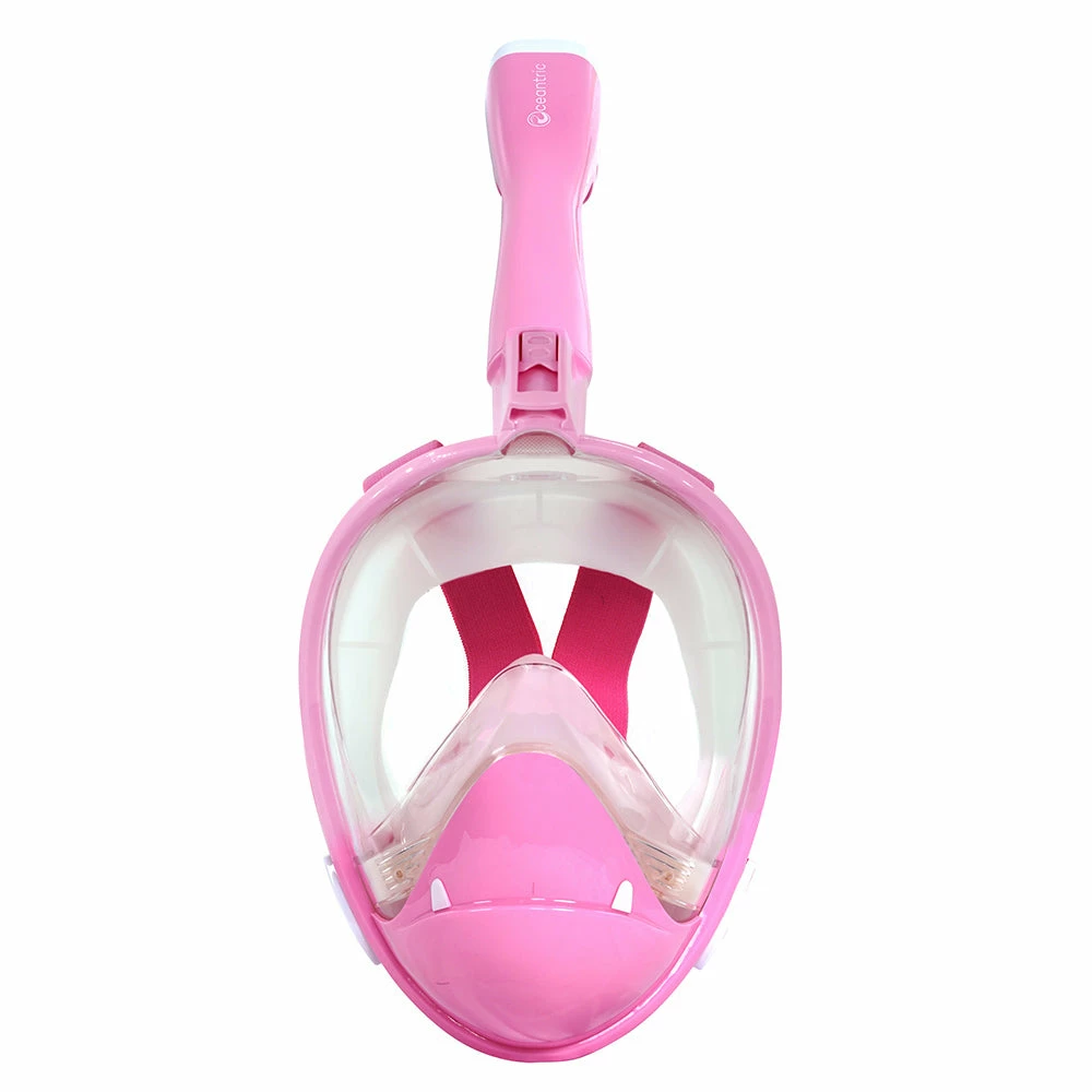 Experience the wonders of the sea with Oceantric Full Face Snorkel Mask 3.0. Swim safely and comfortably with the ergonomic breathing chamber, anti-fog technology, and slanted lens. The high-quality silicone snorkel mask is flexible, comfortable to wear for any face shape, and available in three sizes to fit kids up to adults.