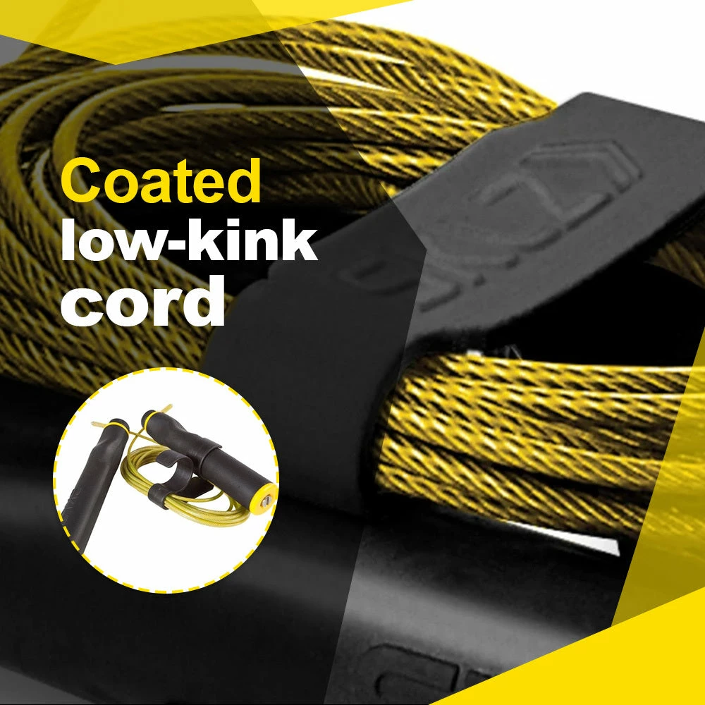 A dual ball bearing and steel rod system combined with slim, ergonomic handles and a low-kink, see-through cord to make this a true high performance speed rope.