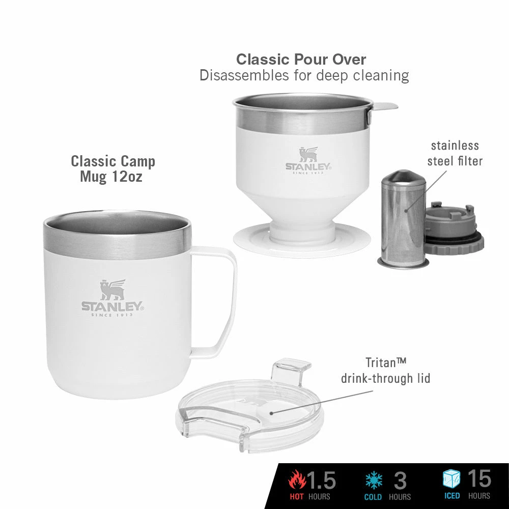 Make the best-brewed coffee by using the Stanley Classic Perfect-Brew Pour-Over Set. This set consists of the Stanley Classic Pour Over and Camp Mug (12 oz). Brew coffee like a pro with the Stanley Classic Perfect-Brew Pour-Over Set.