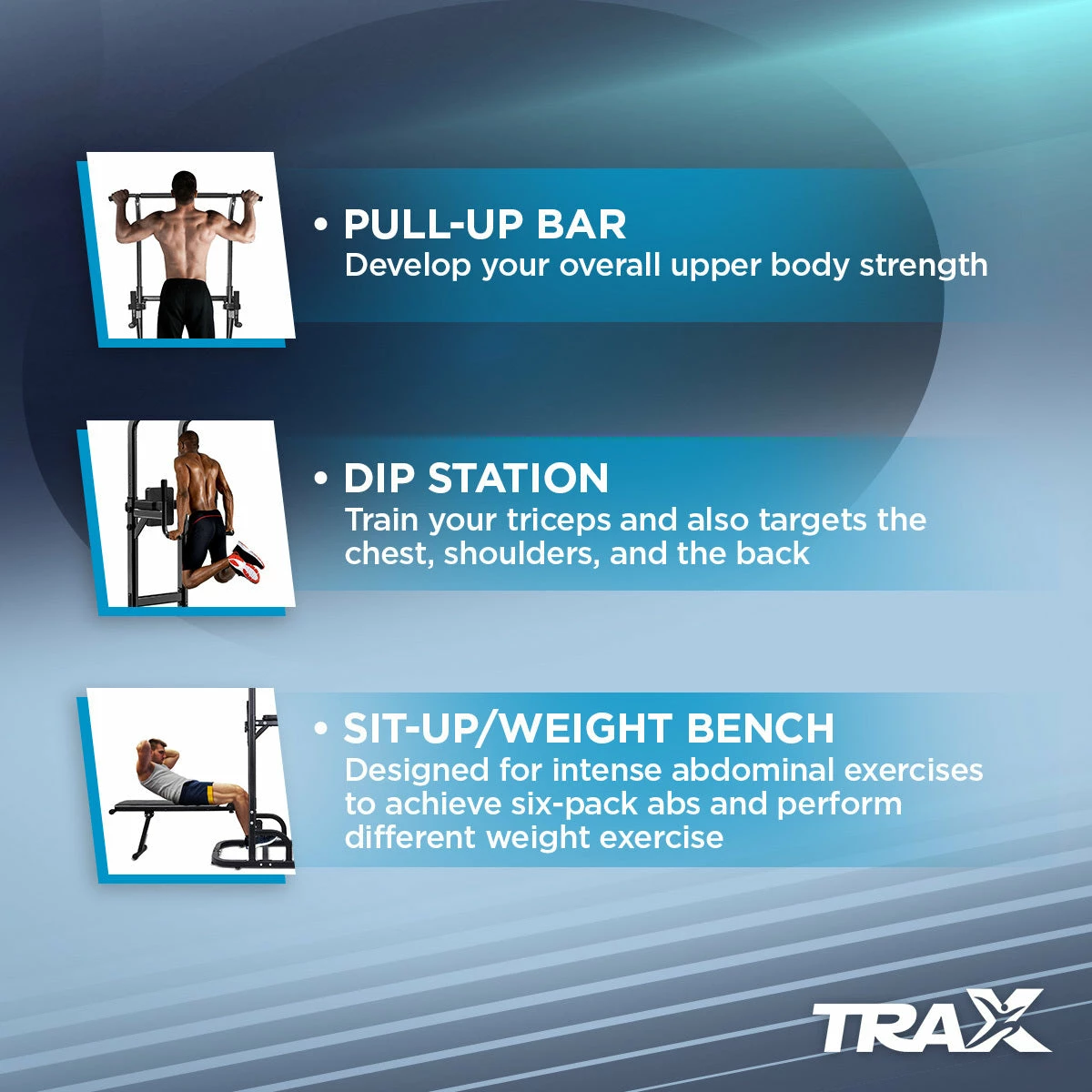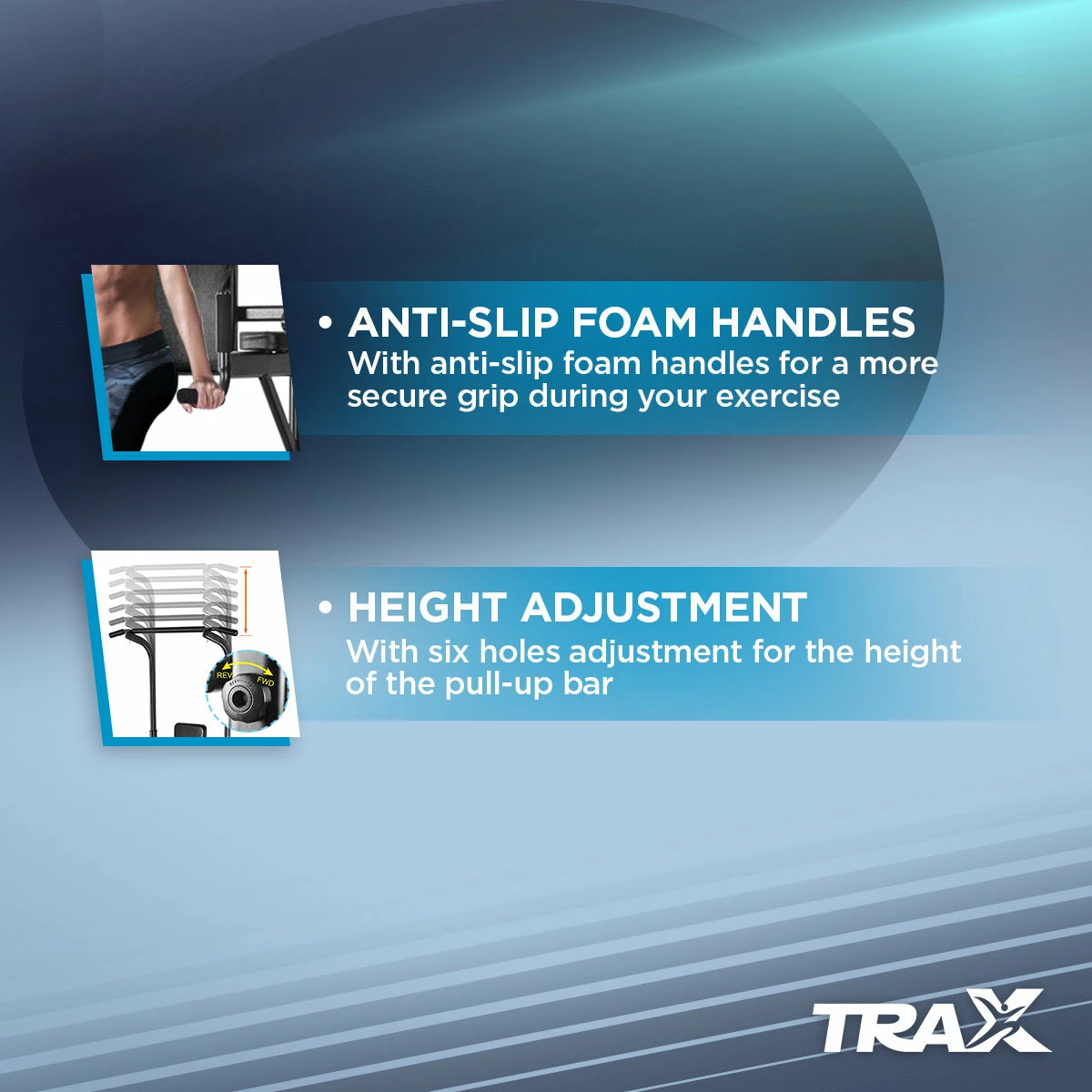 Trax Strength Pull-up Station is reliably built with durable materials of metal body frame and advanced Pu. The Trax Pull-Up Station is a great addition to your home gym and can be placed either in indoor or outdoor set-up. - ANTI-SLIP FOAM HANDLES