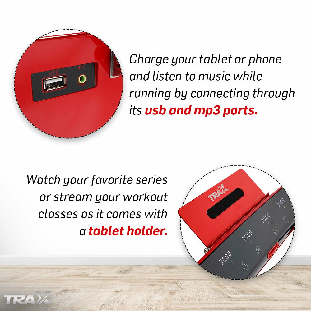 Watch and work while you run with the tablet and cellphone holder on Trax USR 2.0 Treadmill. Never have to worry about low power and plug in your devices on the USB port for device charging. - SAFE RUN WITH EMERGENCY KEY